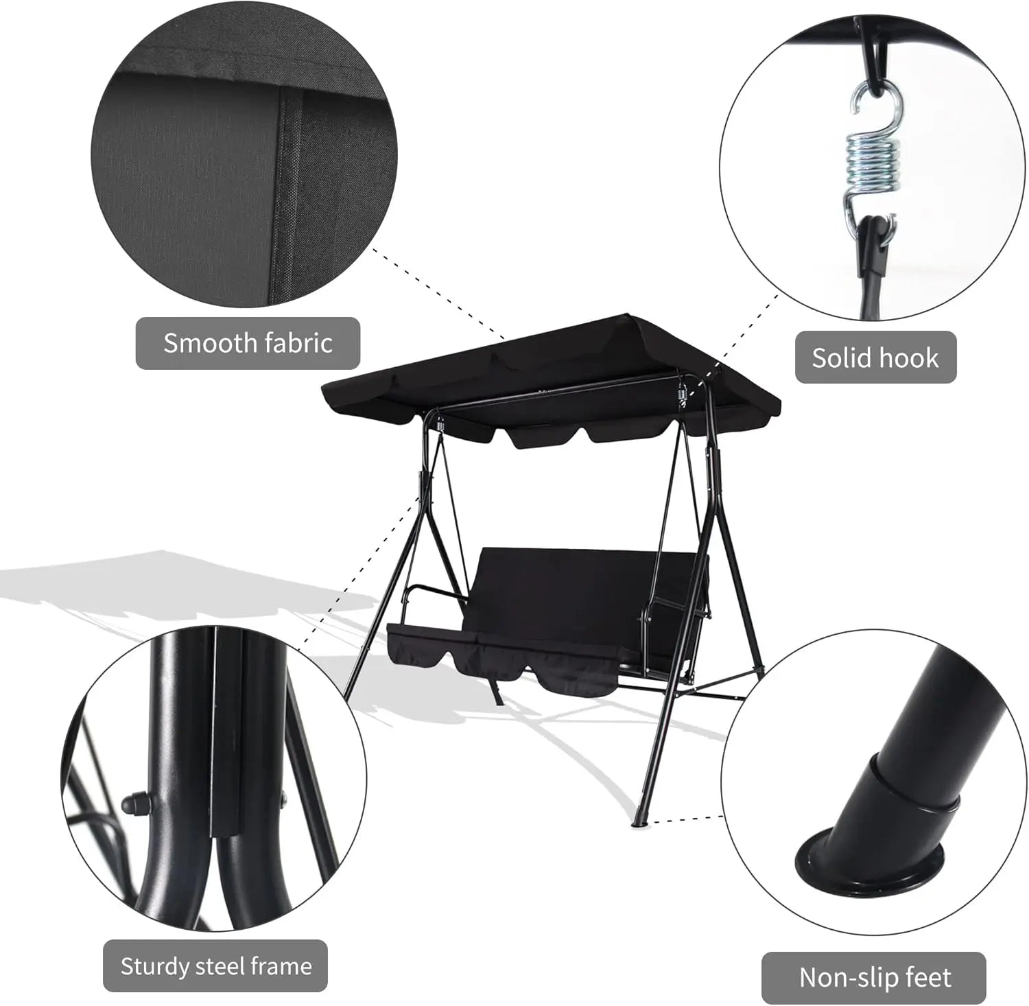 3-Seat Patio Swing Chair,Outdoor Porch Swing with Adjustable Canopy and Durable Steel Frame for Patio, Garden, Poolside (Black)