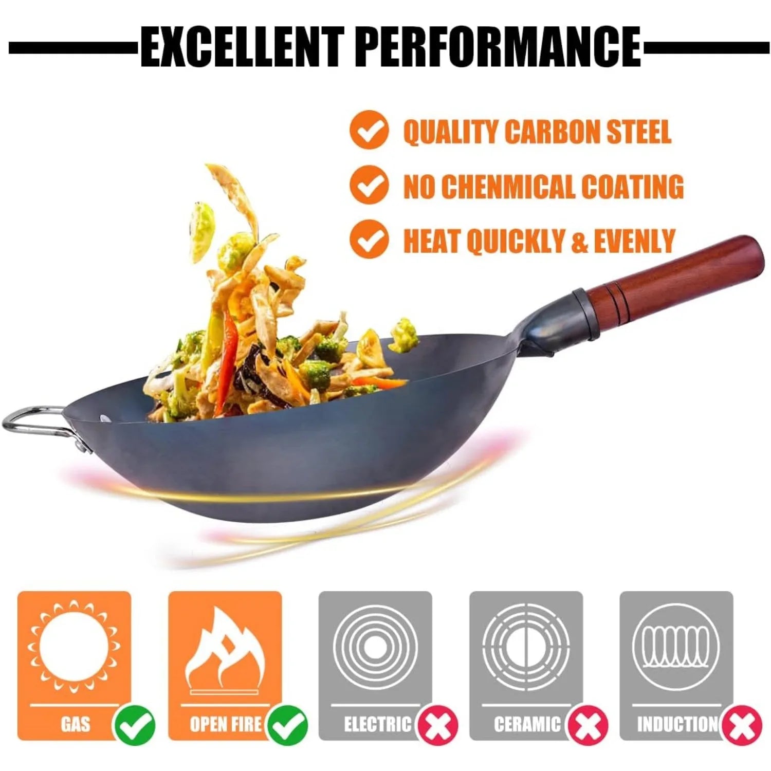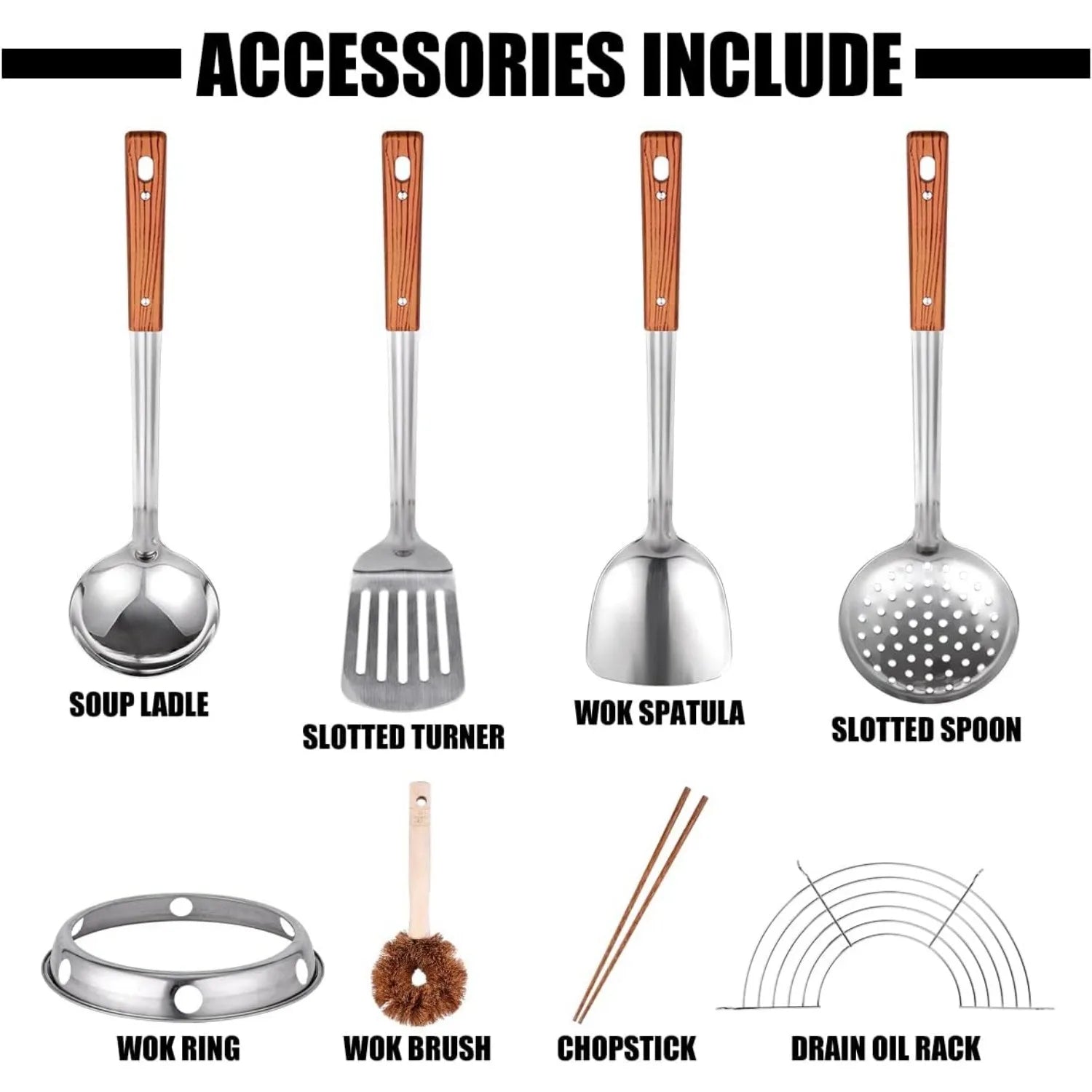 Carbon Steel Wok Traditional Hand Hammered Wok - 13.4" Chinese Wok Round Bottom Wok Pan Set with 8 Pcs Cookware Accessories
