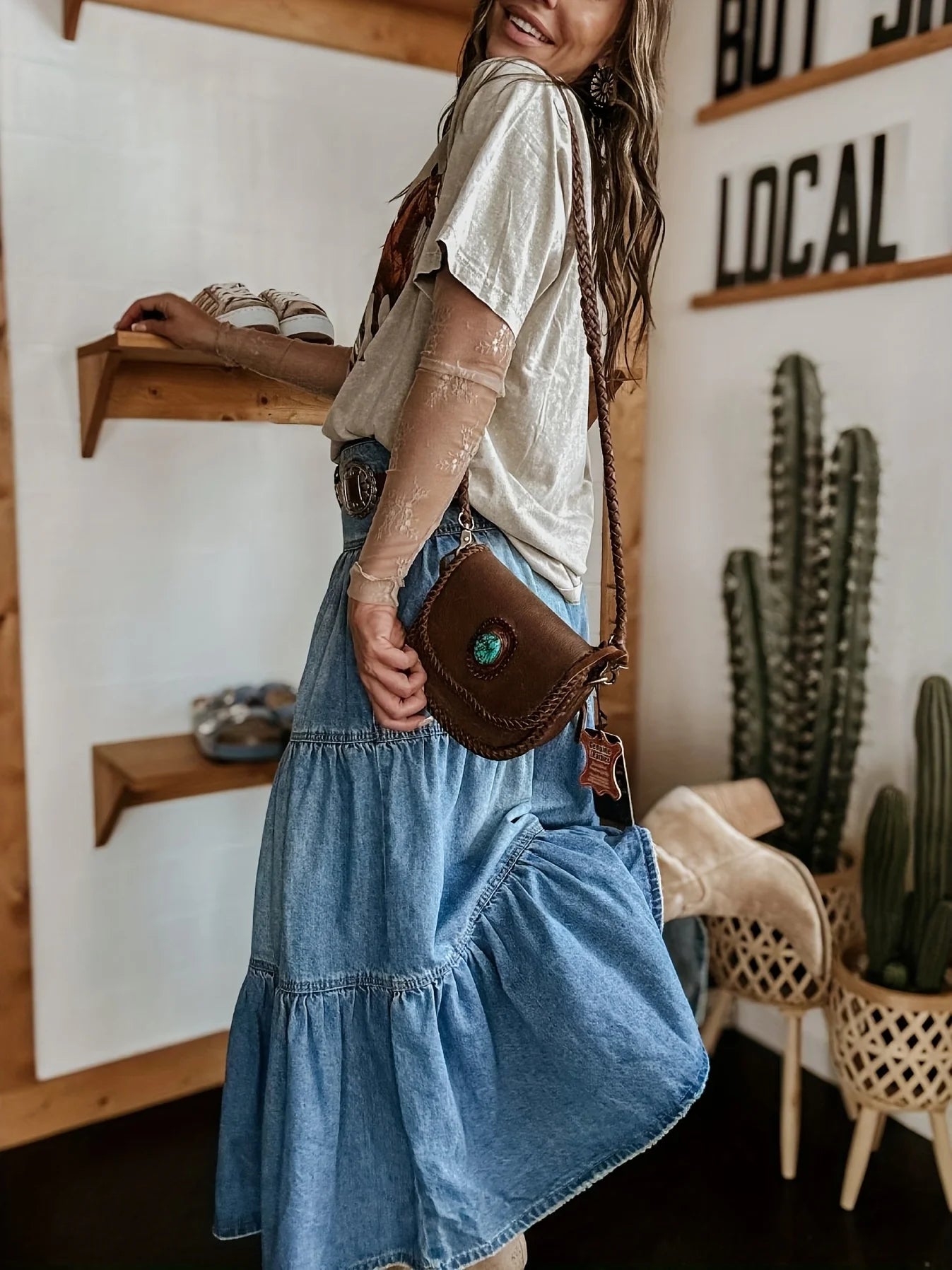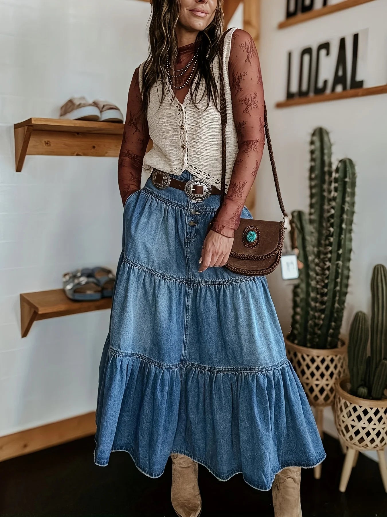 Women's Bohemian A-Line Denim Skirt - Layered Cake Ruffle Design, High Waist Vintage Fashion, Casual Streetwear for Spring Summe