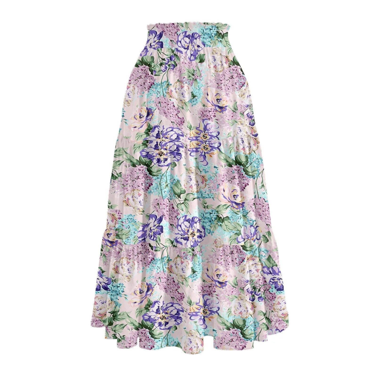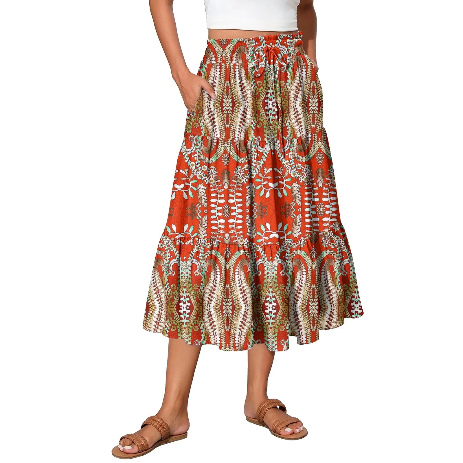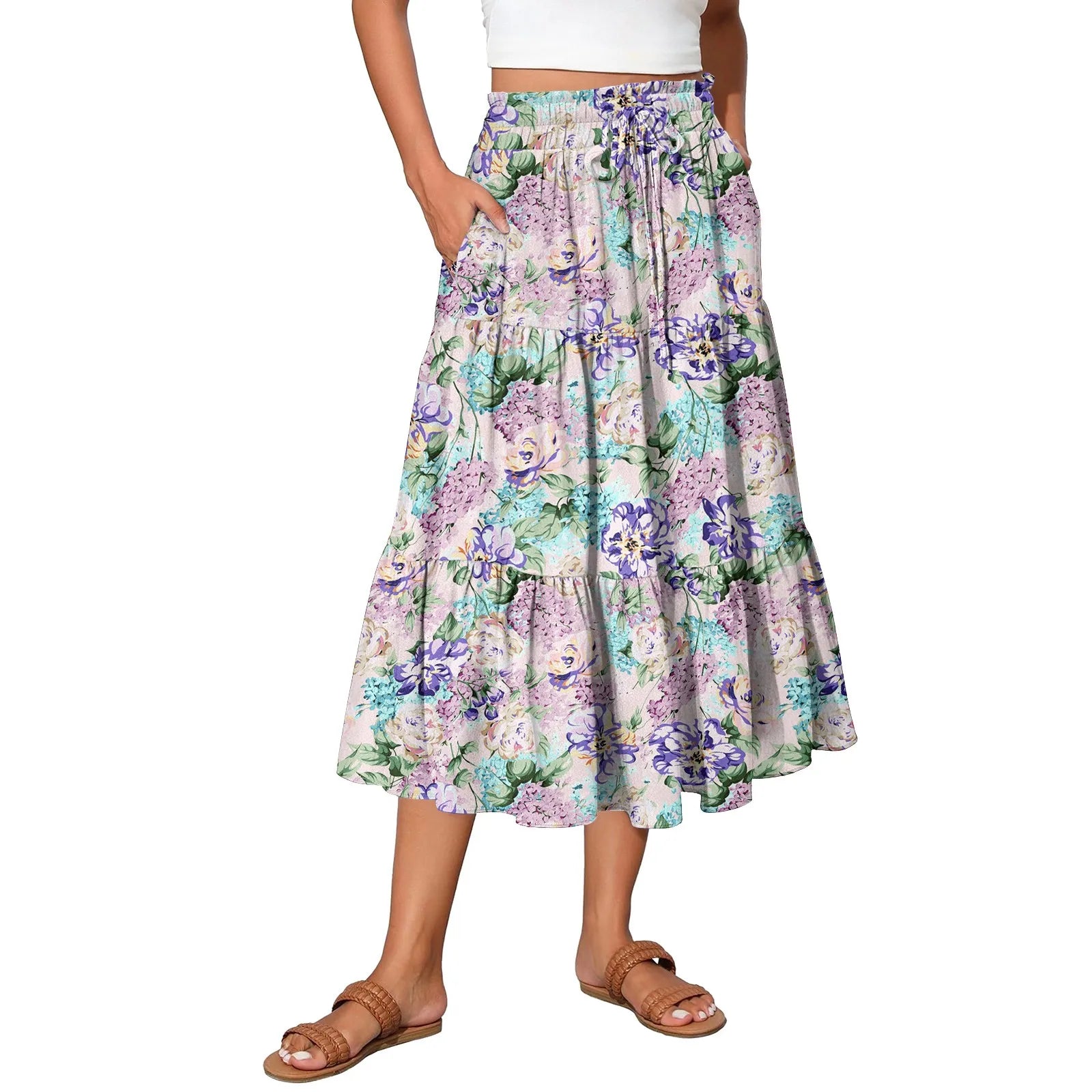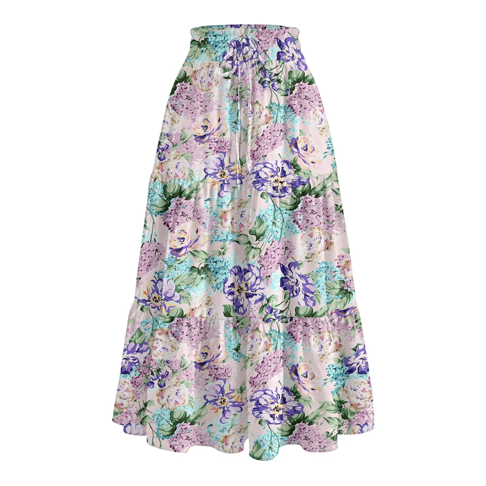 Womens Maxi Skirt Drawstring High Waisted Summer Long Skirts Lightweight Tiered Flowy Floral Pleated Skirts Vestidos Para Mujer